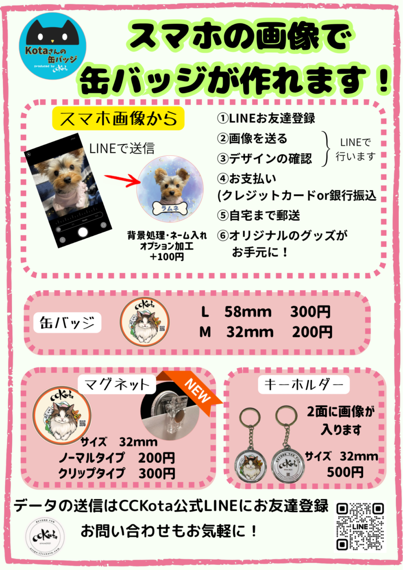 CCKotaでもすでに多くの方からキャンステのご注文をいただいていますが、最近は缶バッジを作れないかとのお問い合わせを多くいただいており、缶バッジの受注製作を始めました。